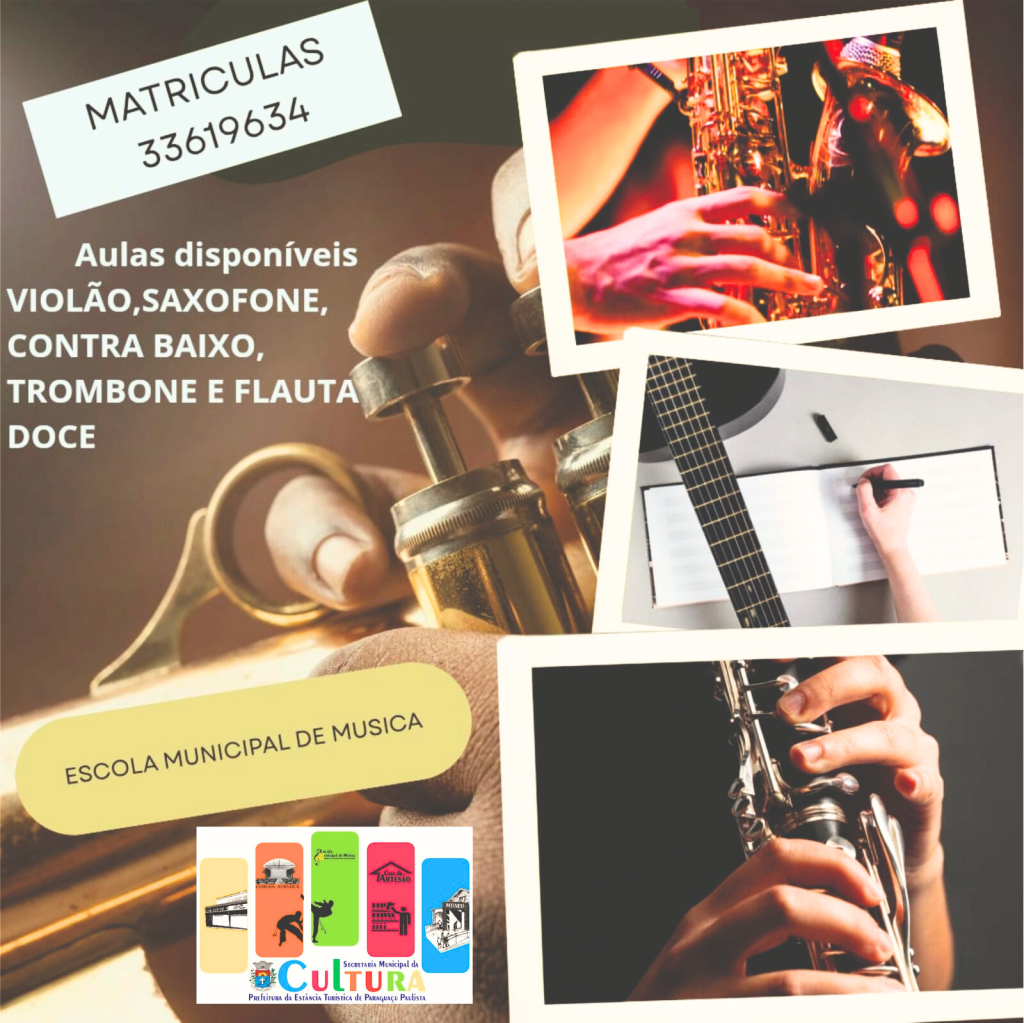 A Prefeitura de Paraguaçu Paulista, por meio da Secretaria Municipal de Cultura, abriu matrículas para aulas de violão, saxofone, contrabaixo, trombone e flauta doce, que serão oferecidas na Escola Municipal de Música e ministradas pela Associação Cultural Maestro Cícero Siqueira. Os interessados podem obter mais informações pelo telefone (18) 3361-9634.