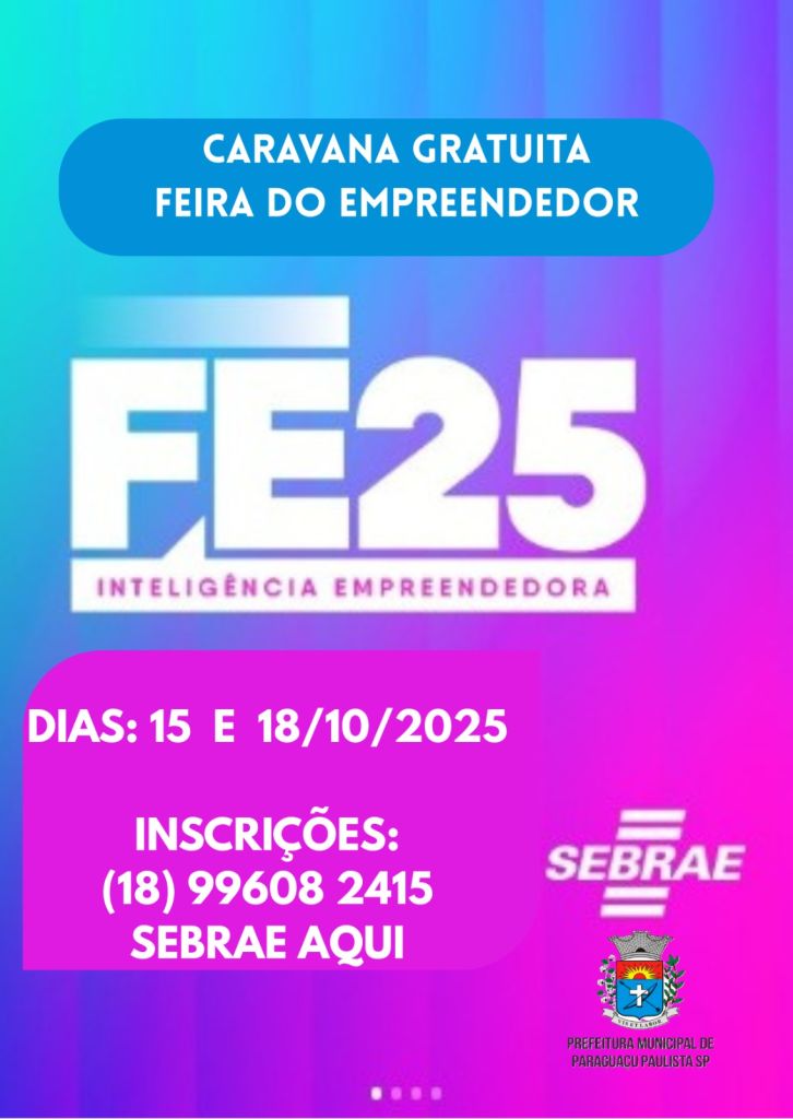 O SEBRAE/SP e a Prefeitura de Paraguaçu Paulista, em parceria com a Secretaria Municipal de Desenvolvimento Econômico, estão organizando uma Caravana 100% gratuita para levar os empreendedores locais à Feira do Empreendedor 2025, o maior evento de negócios da América Latina. A iniciativa oferece a oportunidade de conhecer de perto as principais tendências do mercado, se conectar com milhares de empreendedores, investidores e potenciais clientes em busca de soluções inovadoras, além de se inspirar para impulsionar o crescimento e o desenvolvimento das empresas da região.