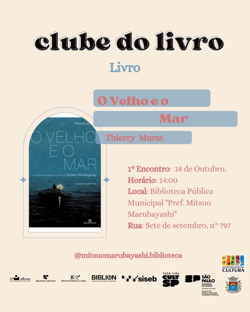 O Clube do Livro de Paraguaçu Paulista realiza no dia 18 de outubro mais um encontro literário, desta vez com a leitura do clássico “O Velho e o Mar”, em uma bela adaptação gráfica assinada por Thierry Murat, inspirada na obra de Ernest Hemingway. A escolha do mês promete emocionar os participantes com uma narrativa sobre coragem, solidão e resistência, ilustrada por imagens poéticas que dão novo fôlego a um dos maiores ícones da literatura mundial.