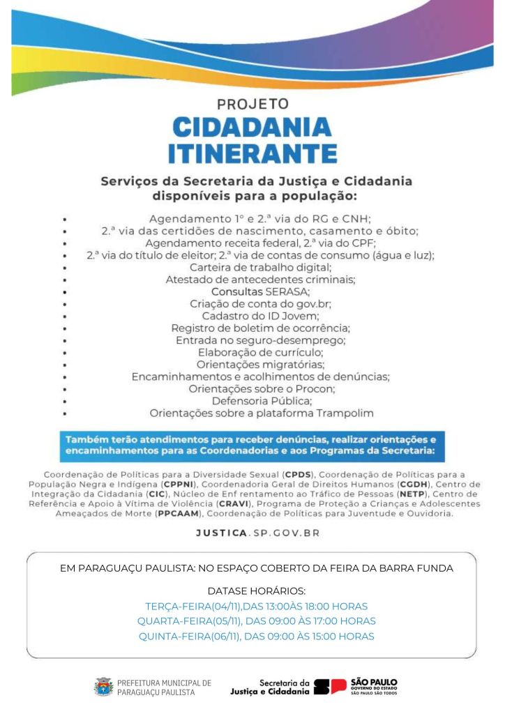 A Prefeitura Municipal de Paraguaçu Paulista, por meio da Secretaria de Desenvolvimento Econômico, em parceria com a Secretaria da Justiça e Cidadania do Governo do Estado de São Paulo, realiza nos dias 4, 5 e 6 de novembro o projeto Cidadania Itinerante. A iniciativa acontece no espaço coberto da Feira da Barra Funda e disponibilizará gratuitamente diversos serviços essenciais à população, como emissão e segunda via de documentos e certidões, carteira de trabalho digital, atestado de antecedentes criminais, consultas ao Serasa, criação de conta Gov.br, cadastro ID Jovem, elaboração de currículo e orientações sobre Procon, Defensoria Pública e plataforma Trampolim. Também será possível fazer registro de boletim de ocorrência e dar entrada no seguro-desemprego.