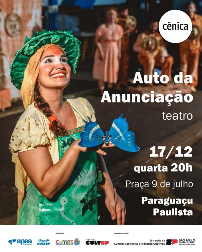 A Prefeitura de Paraguaçu Paulista, por meio da Secretaria Municipal de Cultura, em parceria com a Associação Paulista dos Amigos da Arte (APAA), traz para a Estância Turística o espetáculo de rua “Auto da Anunciação”, apresentado pelo Grupo Cênica, da cidade de São José do Rio Preto (SP). A apresentação acontecerá na próxima quarta-feira (17), às 20h, na Praça da Matriz, integrando oficialmente as festividades natalinas do município.