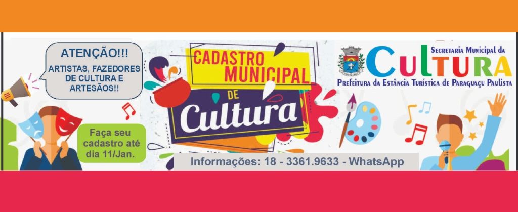 A Prefeitura da Estância Turística de Paraguaçu Paulista, por meio da Secretaria Municipal de Cultura, convoca todos os artistas e fazedores de cultura do município para a atualização do Cadastro Municipal de Cultura, bem como para a realização de novos cadastros até o próximo dia 11. A convocação é destinada a artistas solos, associações culturais, produtores culturais, bandas, duplas, DJs, trios, quartetos, artesãos e artesãs, além de grupos e coletivos culturais, entre outros segmentos que atuam na área cultural local.