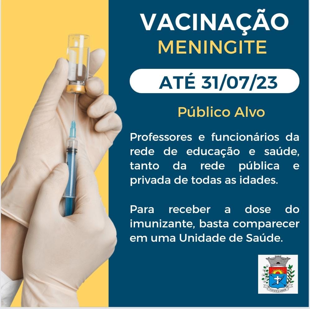 A vacinação contra a meningite para professores e funcionários da rede de educação e saúde, tanto da rede pública e privada (independentemente da idade) se encerra na próxima segunda-feira, dia 31. Quem ainda não recebeu a dose do imunizante pode procurar uma Unidade de Saúde, munido dos documentos de identificação.