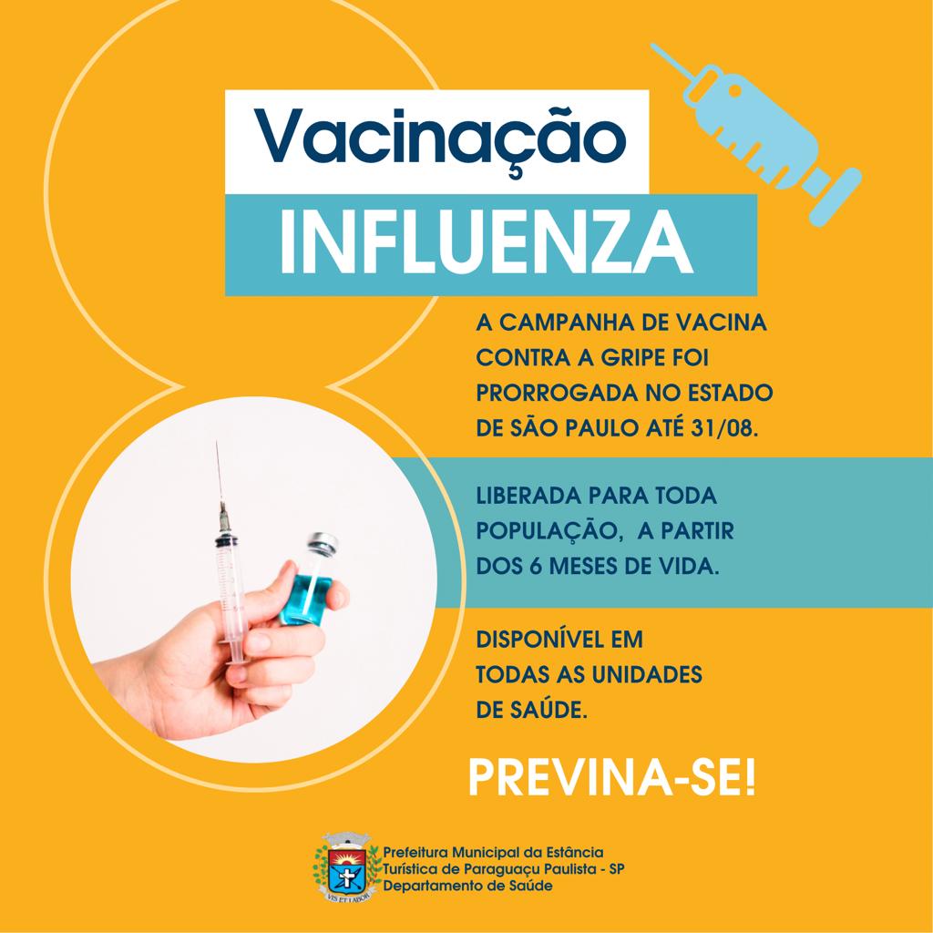 O Estado da Saúde de São Paulo, prorrogou até 31 de agosto, a campanha de vacinação contra Influenza (gripe), para a população acima de seis meses. Em Paraguaçu Paulista, todas as Unidades de Saúde tem vacinas disponíveis, basta se dirigir a uma delas munidos de documentos de identificação e a carteirinha de vacina.