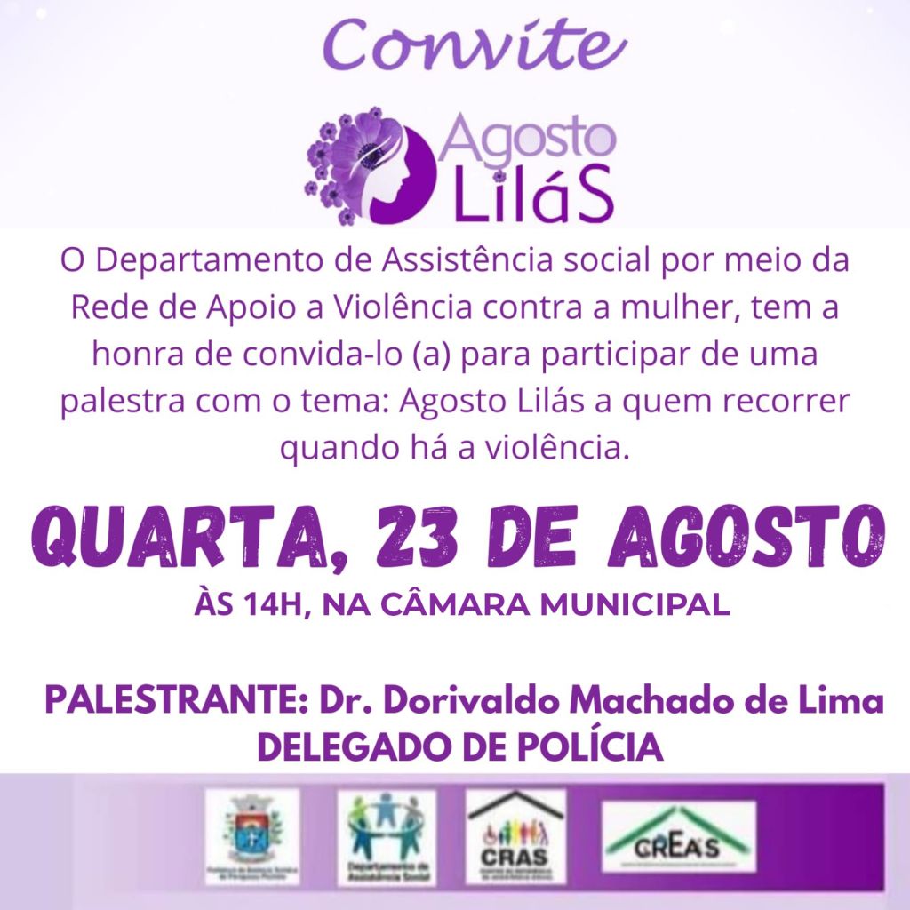 O Departamento Municipal de Assistência Social, por meio da Rede de Apoio a Violência contra a Mulher, promove no dia 23 de agosto uma palestra com o tema: Agosto Lilás – a quem recorrer quando há a violência.
