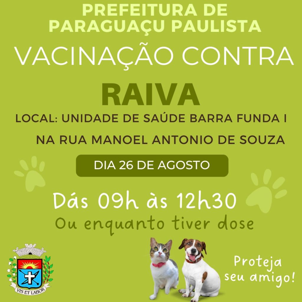 No próximo sábado, dia 26 de agosto, o Departamento de Saúde através da Vigilância em Saúde, realiza mais um dia de vacinação contra a raiva. Nesta data, a vacinação acontece novamente na Unidade de Saúde Barra Funda I, na rua Manoel Antônio de Souza, das 9h00 às 12h30.