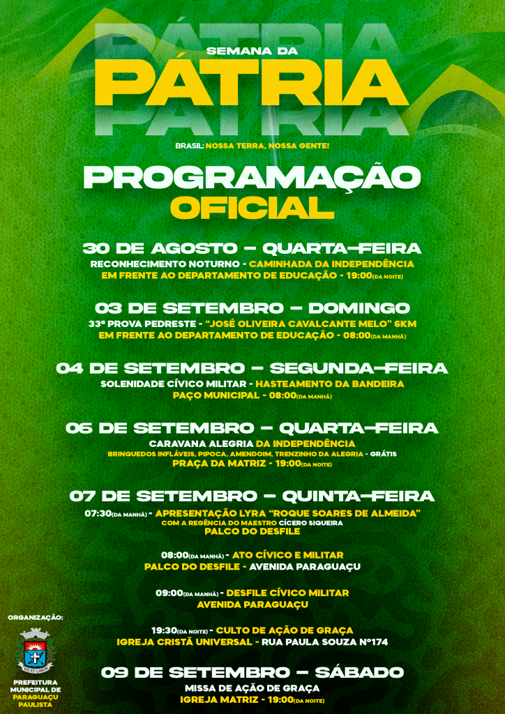 A Prefeitura Municipal de Paraguaçu Paulista, por meio da Comissão Permanente de Eventos, realizará um grande Desfile Cívico em comemoração à Independência do Brasil. O evento será, como ocorre tradicionalmente, na Avenida Paraguaçu.