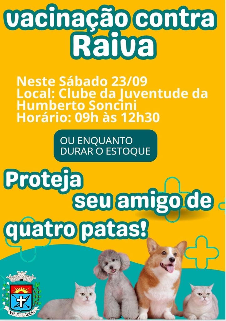 Neste sábado, dia 23 de setembro, o Departamento Municipal de Saúde, por meio da Vigilância em Saúde, realiza mais uma etapa de vacinação contra a raiva em Paraguaçu Paulista. Nesta data, a vacinação acontece em frente ao Projeto Clube da Juventude da Humberto Soncini, das 9h às 12h30.