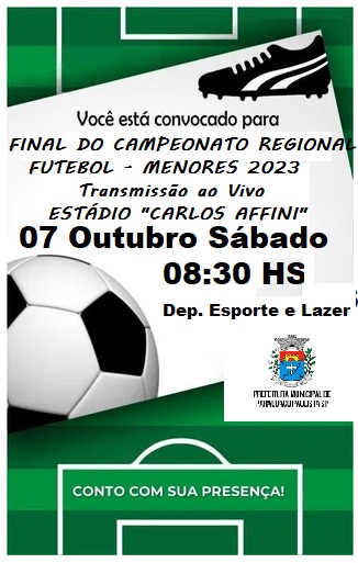 Neste sábado, dia 7 de Outubro, a partir de 08h, no Estádio Municipal "Carlos Affini" acontecerão as finais do Campeonato Municipal de Futebol categoria Menores – 2023.