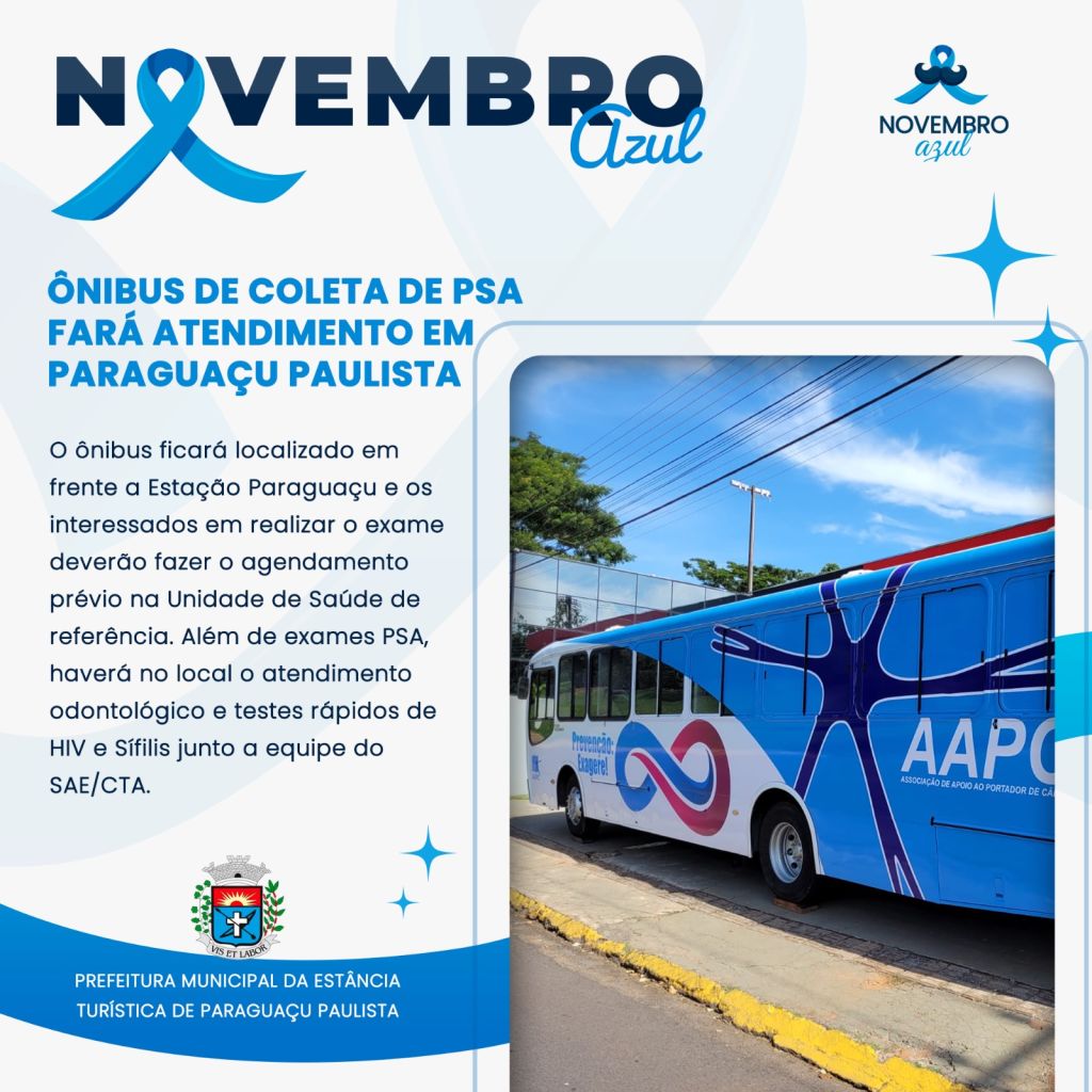 A Prefeitura Municipal de Paraguaçu Paulista, por meio do Departamento de Saúde, em parceria com a Associação de Apoio às Pessoas com Câncer de Presidente Prudente, promove nesta quarta-feira, dia 8 de novembro, das 9h às 16h, o atendimento no ônibus itinerante para coleta de exame Antígeno Prostático Específico, mais conhecido como PSA, que visa o diagnóstico precoce do câncer de próstata.