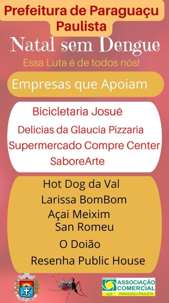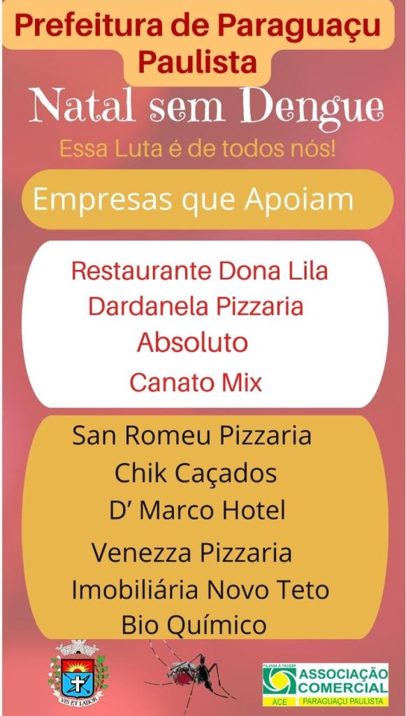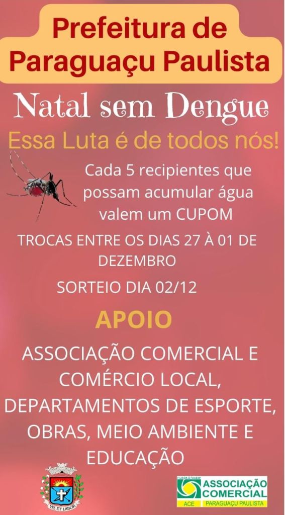 Paraguaçu Paulista realiza de 27 novembro a 02 de dezembro a campanha “Natal sem Dengue – Essa luta é de todos nós!”. A ação tem por objetivo incentivar a comunidade a eliminar potenciais criadouros do mosquito Aedes aegypti, transmissor da dengue, através do dia da troca e sorteio de brindes.