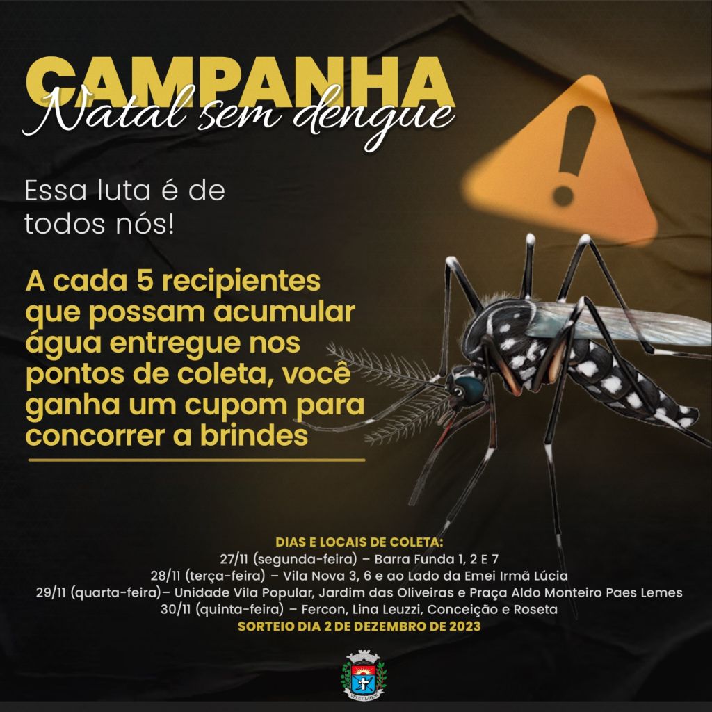 O Departamento Municipal de Saúde, com apoio da Associação Comercial e do comércio local e a parceria dos departamentos de Esporte, Educação, Meio Ambiente e Obras, promove de 27 novembro a 02 de dezembro (segunda a sábado) a campanha “Natal sem Dengue – Essa luta é de todos nós!”.