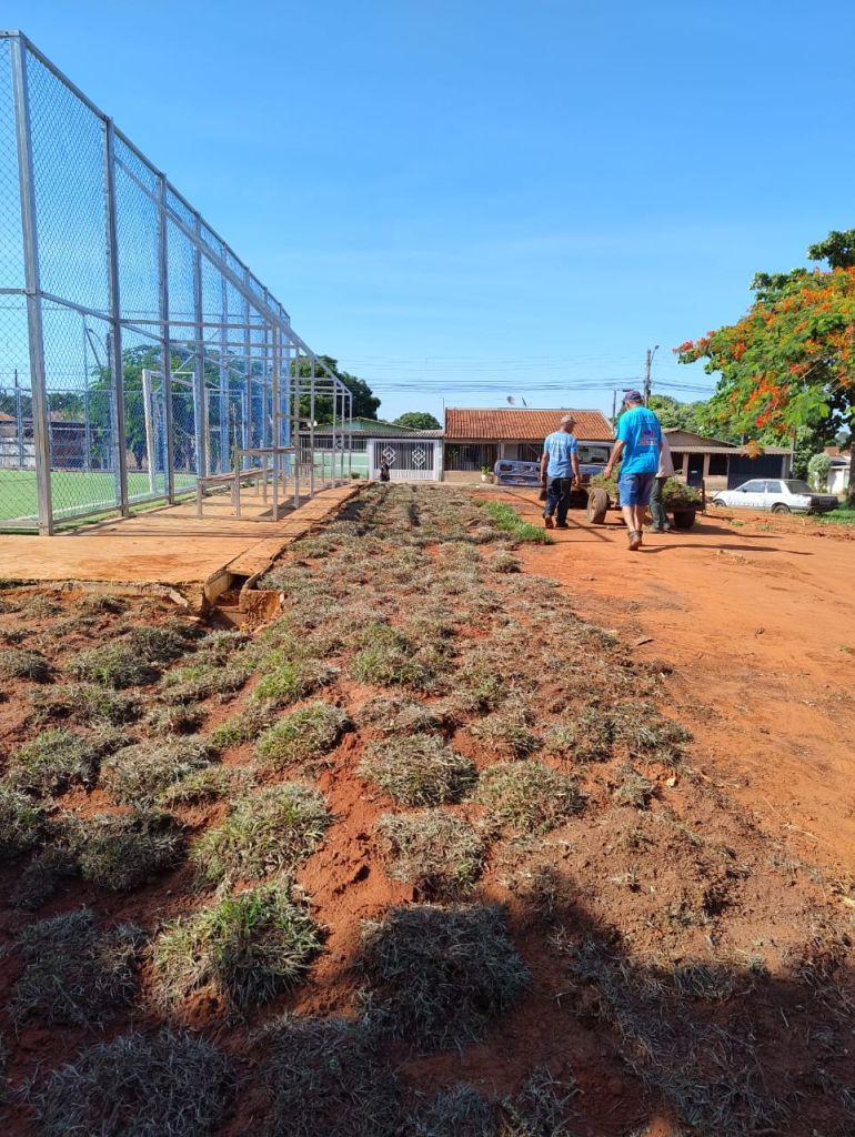 Nessa semana, a empresa contratada está concluindo o plantio de grama nas imediações da área esportiva. Após a etapa de plantio, será realizado o calçamento ao redor da quadra esportiva e também em breve será feita a instalação de brinquedos e outros equipamentos para a comunidade local.