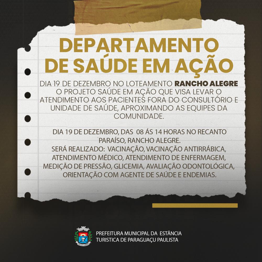 O Departamento Municipal de Saúde promove nesta terça-feira, dia 19 de dezembro, no Loteamento Rancho Alegre, o Projeto “Saúde em Ação”, que visa levar atendimentos aos pacientes fora dos consultórios e Unidades de Saúde, aproximando as equipes da comunidade.