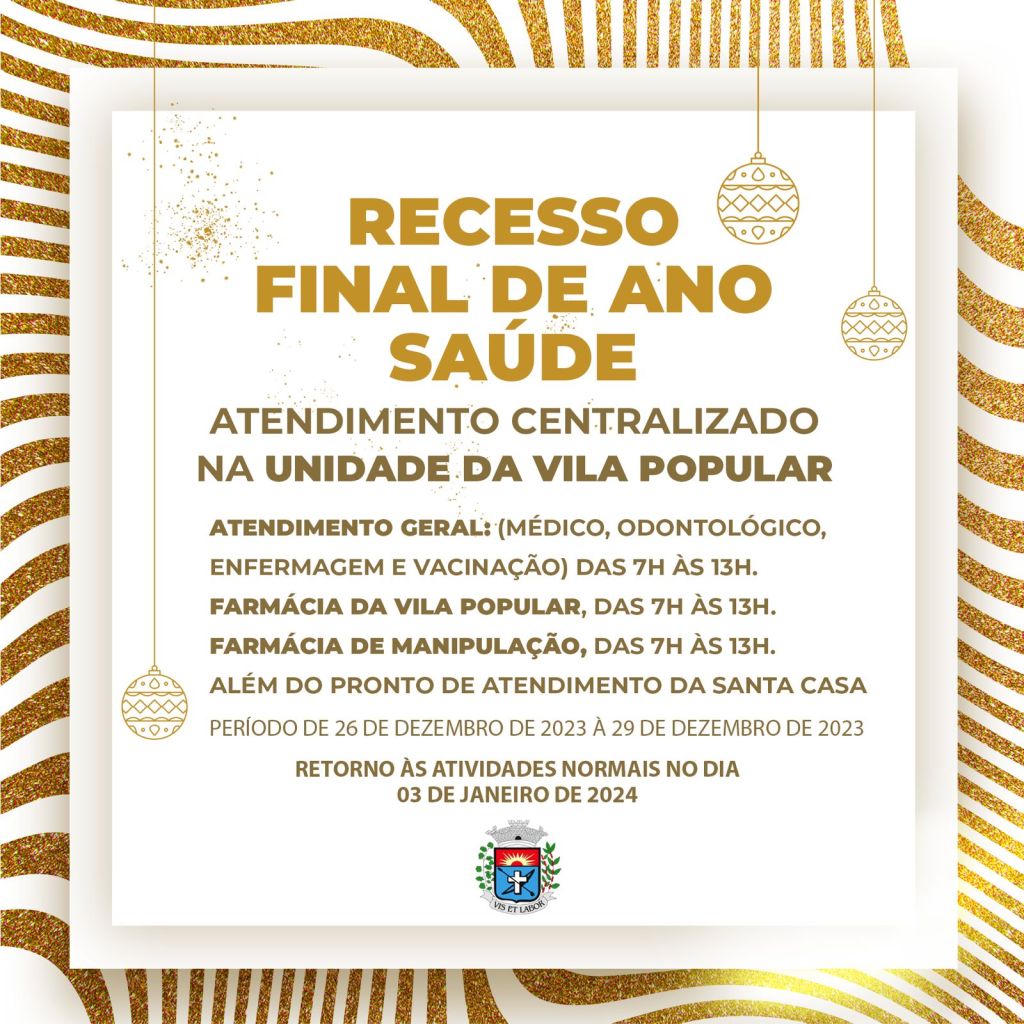 O Departamento Municipal de Saúde reorganizou os atendimentos das suas equipes para este período e realizará o atendimento geral (médico, odontológico, enfermagem e vacinação) centralizado na Unidade da Vila Popular, que atenderá no período de 26 a 29 de dezembro de 2023, no horário das 7h às 13h. Além disso, o trabalho no Pronto Socorro da cidade continua de forma normal, sem interrupções.