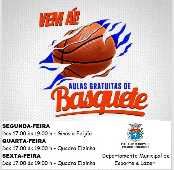 A Prefeitura de Paraguaçu Paulista, através do Departamento Municipal de Esportes e Lazer, dá início às aulas gratuitas de Basquete Masculino no Ginásio de Esportes Feijão e Quadra Poliesportiva Elzinha. Serão turmas de treinamento as segundas, quartas e sextas-feiras, das 17h às 19h.