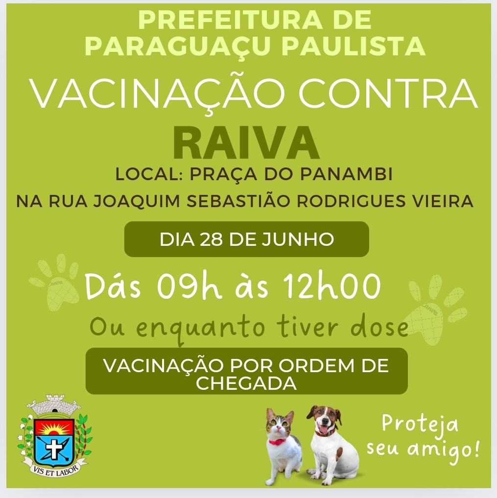 Na próxima sexta-feira, dia 28, o Departamento de Saúde, através da Vigilância em Saúde, realiza mais um dia de vacinação contra a raiva para cães e gatos. Nesta data, a vacinação acontece em frente a Praça do Panambi, situado na rua Joaquim Sebastião Rodrigues Vieira, das 9h00 às 12h00, ou enquanto tiver doses.