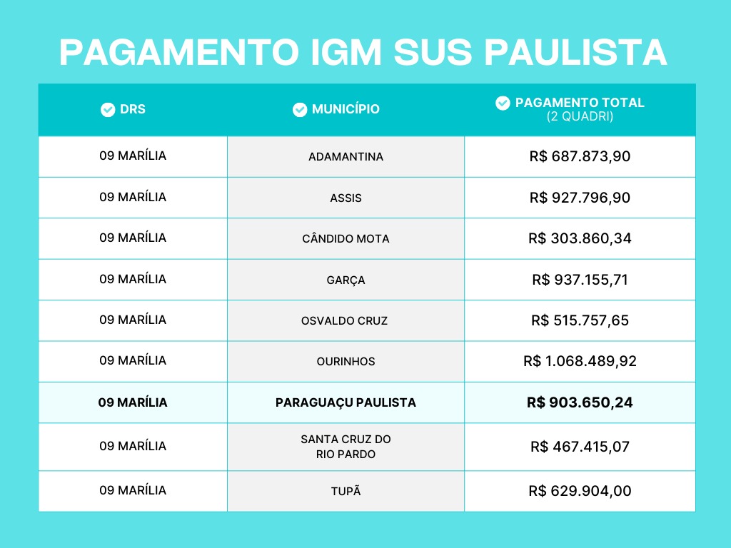 No dia 21 de junho foi realizada no Palácio dos Bandeirantes, a cerimônia de autorização do repasse antecipado de R$ 412 milhões pelo programa IGM SUS Paulista – Incentivo à Gestão Municipal. E o município de Paraguaçu Paulista está em destaque de recebimento. Para se ter uma ideia, os valores recebidos são praticamente iguais aos de cidades como Assis e Ourinhos que têm mais que o dobro de habitantes.