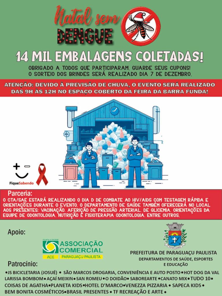 Agradecemos a todos os participantes que se engajaram na campanha e contribuíram para uma Paraguaçu Paulista mais saudável. A mobilização da comunidade foi essencial para o sucesso da ação, demonstrando que juntos podemos fazer a diferença. A campanha "Natal Sem Dengue" contou com o apoio da Prefeitura Municipal de Paraguaçu Paulista e da Associação Comercial de Paraguaçu Paulista. Além disso, teve o patrocínio de diversas empresas locais que se uniram à causa, incluindo JS Bicicletaria (Josué), São Marcos Drogaria, Conveniência e Auto Posto, Hot Dog da Val, Larissa Bombom, Açaí Meixin, San Romeu, O Doidão, Saboreate, Canato Mix, Tudo 10, Coisas de Agatha, Planeta Kids, Hotel D’Marco, Venezza Pizzaria, Sapeca Kids, Bem Bonita Cosméticos e Brasil Presentes.