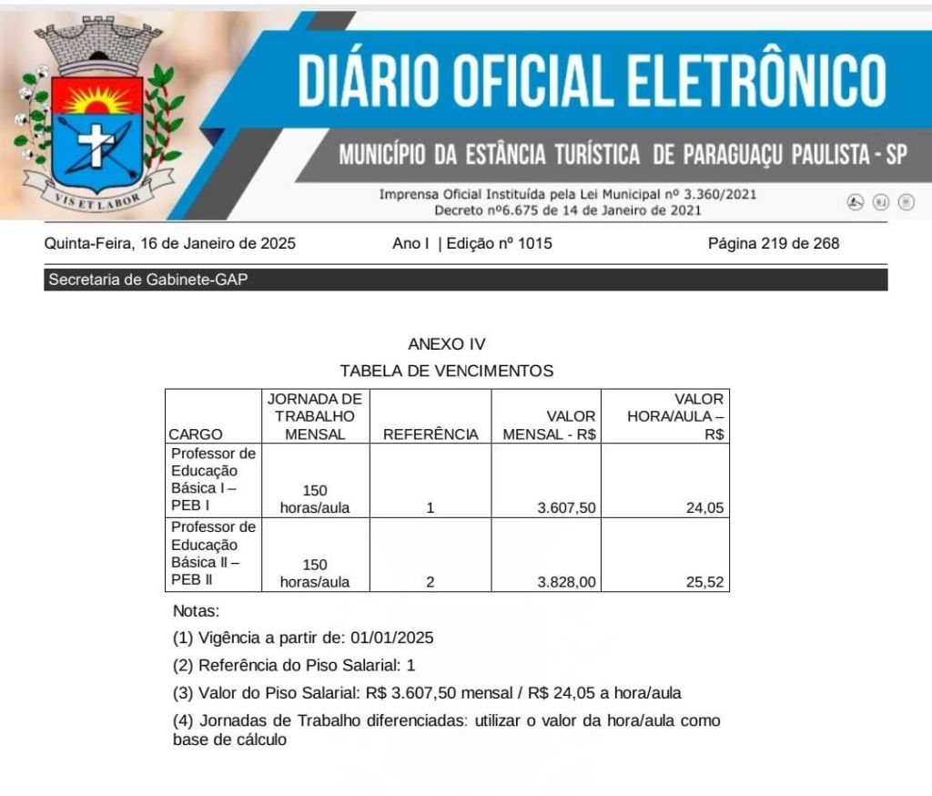O Diário Oficial da Prefeitura de Paraguaçu Paulista desta quinta-feira (16) publicou a lei do piso salarial dos professores da Rede Municipal de Educação sancionada pelo prefeito Antian Sasada. Com vigência a partir de 1º de janeiro de 2025, o piso para os profissionais do magistério público da educação básica será de R$ 3.607,50 mensal, ou R$ 24,05 a hora/aula, correspondente à referência PEB I, e R$ 3.828,00 ou R$ 25,52 a hora/aula para PEB II.