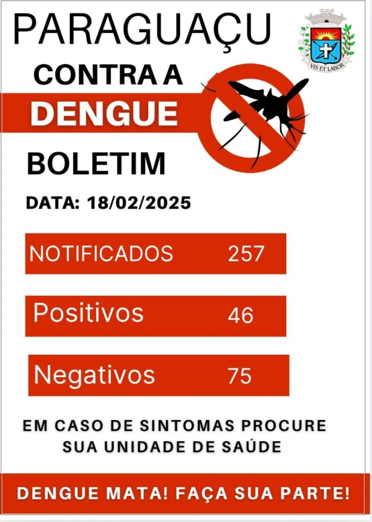 O número de casos confirmados de dengue em Paraguaçu Paulista saltou de 24 para 46 no período de uma semana. De acordo com o boletim epidemiológico da Vigilância em Saúde do município, divulgado nesta terça-feira (18), o número de notificados também subiu consideravelmente: de 197 para 257 prováveis casos.