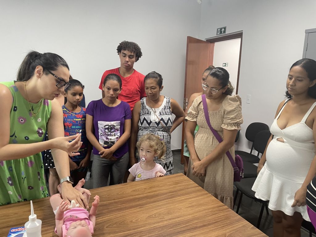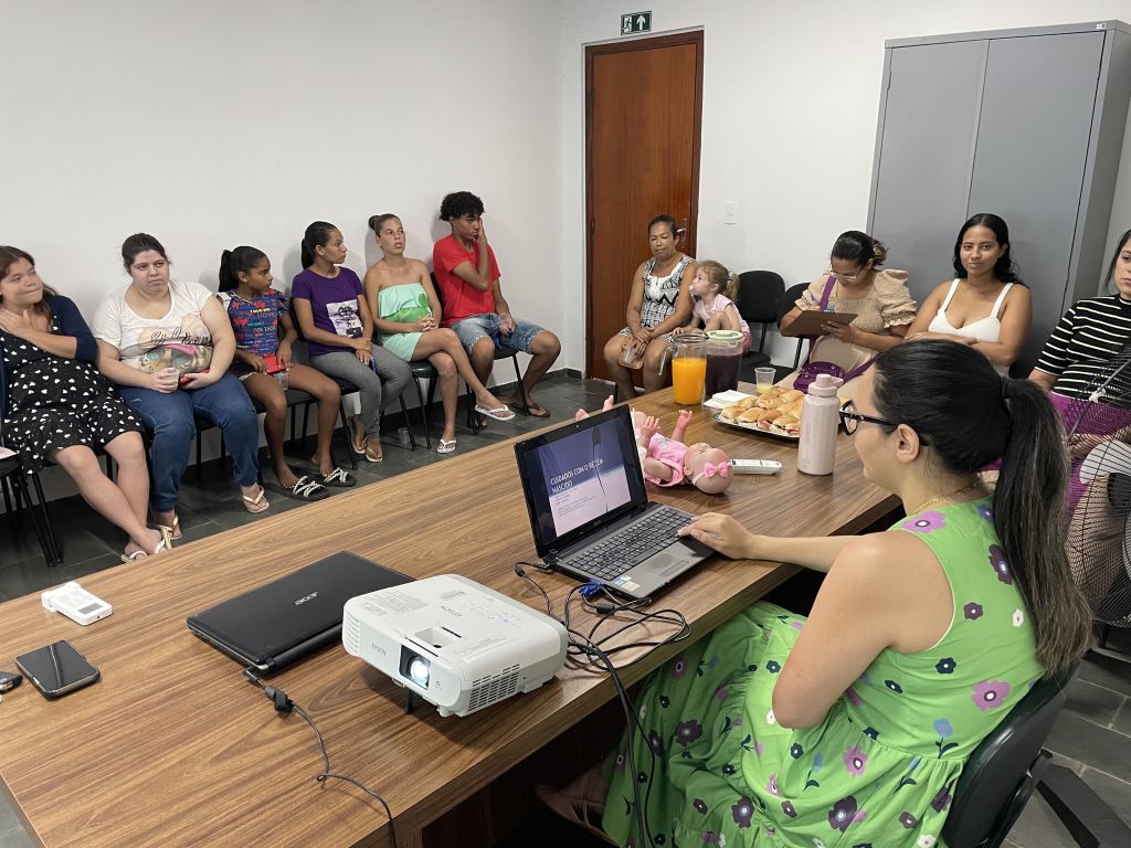 Pediatra orienta gestantes e mães sobre amamentação, higiene e segurança do bebê em encontro semanal