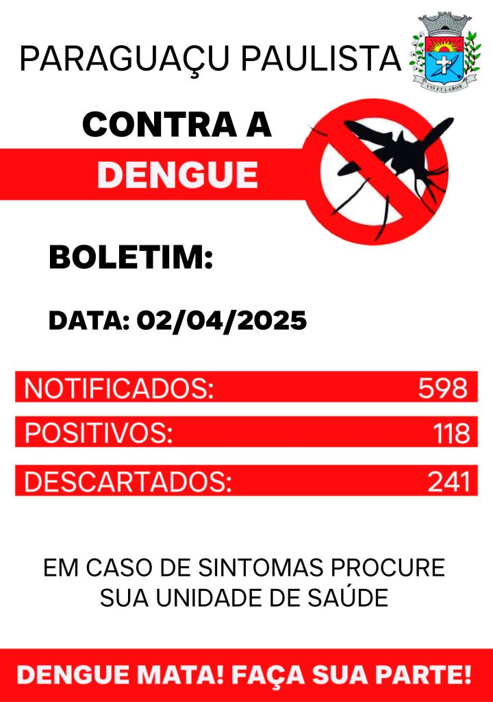 O Departamento de Saúde, por meio da Vigilância em Saúde, divulga semanalmente o número de casos de Dengue em Paraguaçu Paulista. Da semana passa para esta, é possível perceber um aumento de alarmantes cerca de 34% casos de dengue. Esses números são preocupantes! Comparando com o boletim divulgado dia 18 de março, apenas há duas semanas atrás, observamos um crescimento acelerado no número de casos, totalizando um aumento de cerca de 55,26% em relação à semana anterior à passada (de 76 para 118 casos).