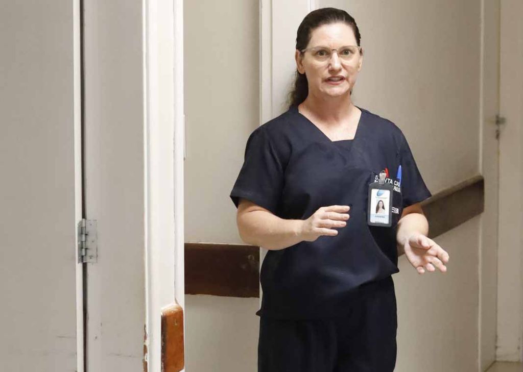 A Santa Casa também conta com incubadoras e um aparelho de fototerapia para casos em que o bebê apresenta níveis elevados de bilirrubina. Outros exames, como o teste do pezinho e da orelhinha, além das vacinas, são realizados posteriormente por um pediatra. Após essa parte da visita, as futuras mamães conheceram o berçário, onde os bebês permanecerão até receber alta. Lidiana explicou que, segundo normas do Ministério da Saúde, mães e bebês são liberados em até 48 horas após o parto se não houver riscos associados. Esse período é considerado essencial para a segurança dos recém-nascidos.