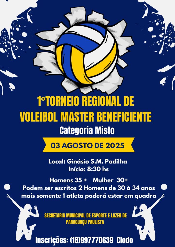 A Prefeitura de Paraguaçu Paulista, por meio da Secretaria Municipal de Esportes e Lazer, realizará o 1º Torneio Regional de Voleibol Master Beneficente. A competição, que acontecerá no Ginásio de Esportes Sylvio Magalhães Padilha, promete reunir atletas veteranos e apaixonados pelo esporte, promovendo integração, solidariedade e valorização do voleibol regional.