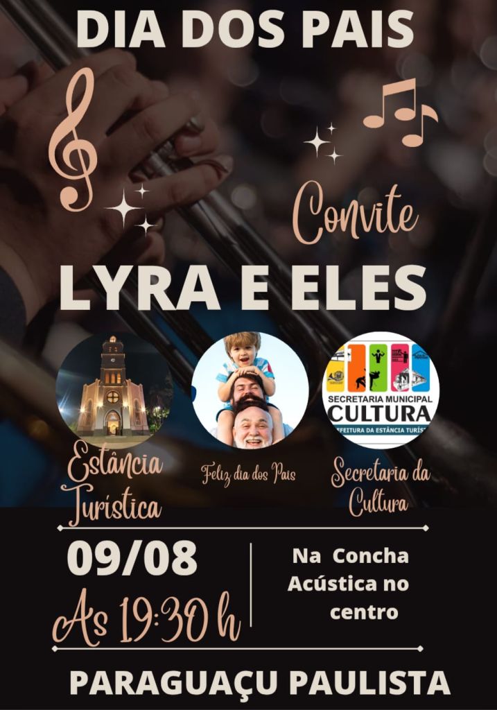 A Concha Acústica da Praça da Fonte Luminosa será palco do evento musical “Lyra & Eles” no próximo dia 9 de agosto. Promovido pela Secretaria Municipal de Cultura de Paraguaçu Paulista, o espetáculo é uma homenagem especial ao Dia dos Pais. A Banda Lyra Maestro Roque Soares de Almeida se apresentará sob a regência do maestro Cícero Siqueira, trazendo ao público um repertório emocionante em celebração à data.