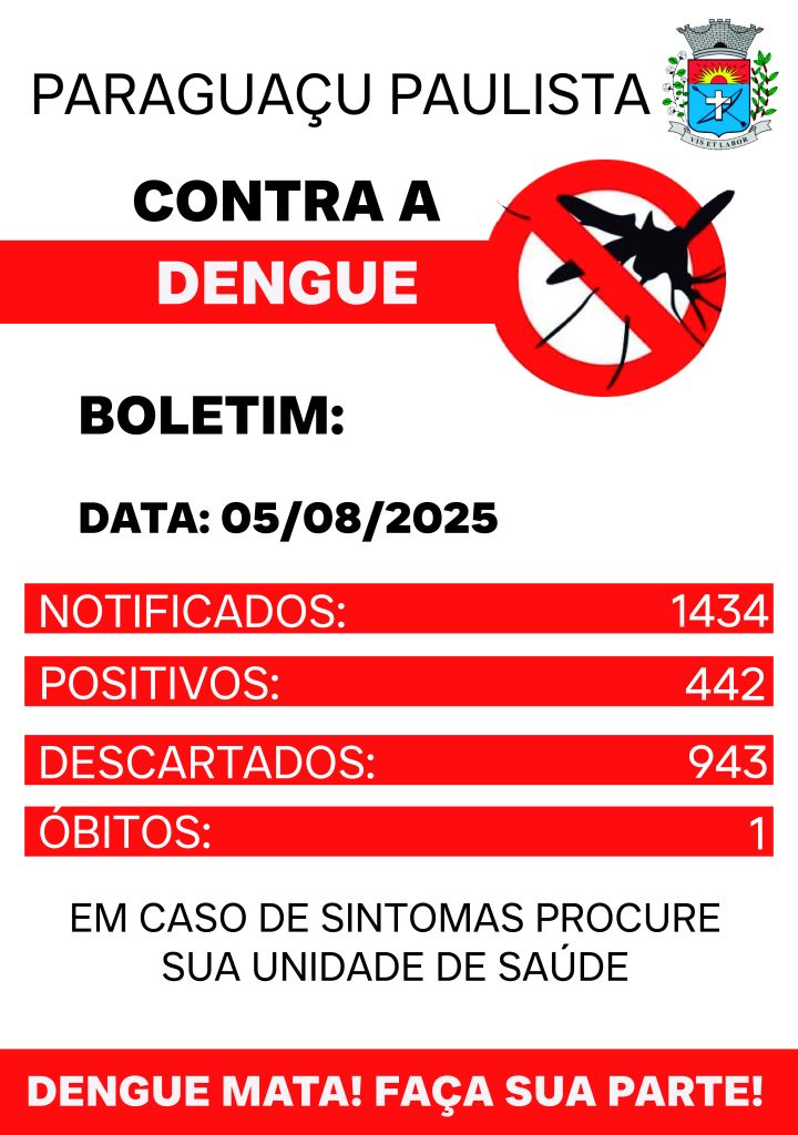A Secretaria de Saúde da Prefeitura de Paraguaçu Paulista divulga o balanço semanal da dengue no município, com uma excelente notícia: a curva de casos segue em queda. Nesta semana, apenas um novo caso foi confirmado, o que é um reflexo do trabalho conjunto entre o poder público e a população. Apesar da tendência positiva, o alerta permanece, e a luta contra o Aedes aegypti não pode parar. O total de casos positivos de dengue em 2025 é de 442 pessoas. Os registros mostram que o pico da doença neste ano ocorreu entre os dias 11 e 17 de maio, quando foram registrados 32 casos positivos em uma única semana. Desde então, uma redução consistente tem sido observada, muito em parte pela intensificação das ações de prevenção e o apoio da comunidade.