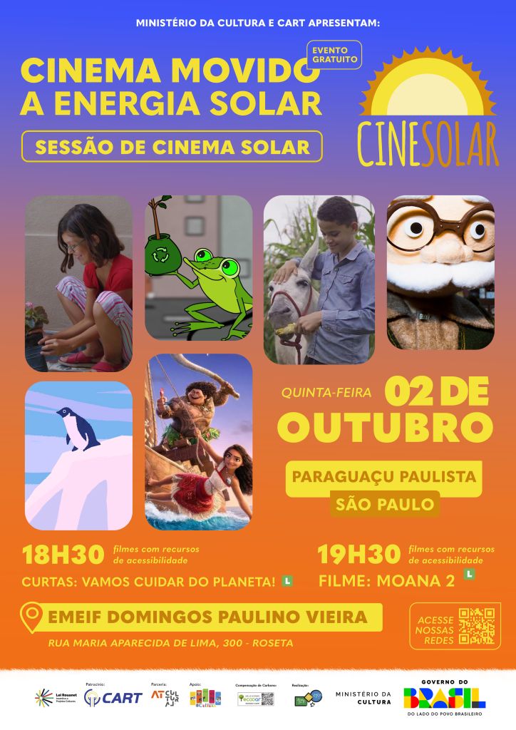 Cinema ao ar livre, pipoca, diversão em família, tudo de graça, com sustentabilidade, ciências e tecnologia. O encanto do CineSolar, o primeiro cinema itinerante movido a energia solar do Brasil, poderá ser vivenciado em Paraguaçu Paulista (SP), na quinta-feira (02/10), a partir das 18h30, na EMEIF Domingos Paulino Vieira, no Distrito de Roseta, com várias atividades para todas as idades. Na telona serão exibidos curtas-metragens ambientais e o filme “Moana 2”. A entrada é livre, não precisa de ingresso, os filmes contam com recursos de acessibilidade e tem distribuição de pipoca.