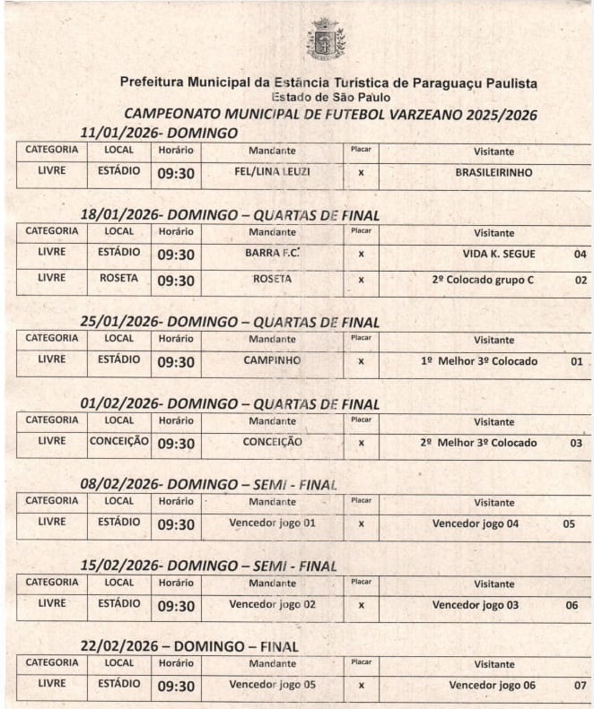 A Prefeitura de Paraguaçu Paulista, por meio da Secretaria Municipal de Esportes e Lazer, anuncia o retorno do Campeonato Municipal Varzeano 2025, que entra agora em sua fase final. A competição, que havia sido paralisada no final do ano, será retomada a partir do próximo domingo (dia 11), com a realização das últimas rodadas que irão definir as equipes finalistas e os campeões da temporada, seguindo a tabela oficial até a grande decisão.