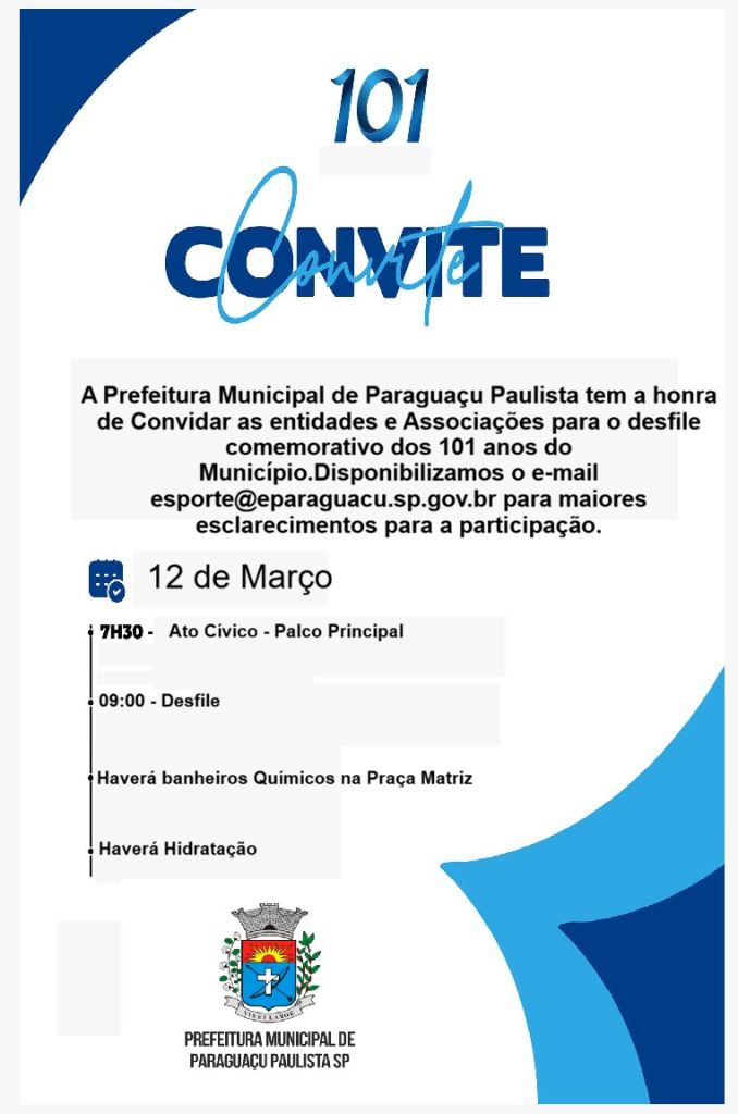 A Secretaria de Esportes e Lazer da Prefeitura de Paraguaçu Paulista convida entidades, escolas particulares, associações e empresas que contribuíram para a construção da história da Princesinha da Alta Sorocabana a participarem das comemorações dos 101 anos do município, durante o tradicional Desfile de Emancipação Político-Administrativa. Será um momento especial de civismo, memória e orgulho coletivo.