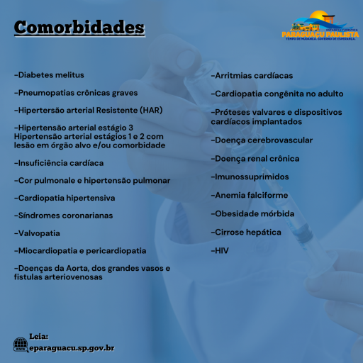 A vacinação contra a Covid-19 para os grupos de comorbidades prossegue na quarta-feira (12/05), desta vez, exclusivamente, para pessoas de 55 a 59 anos de idade. Poderão tomar a primeira dose nos postos de Saúde os que apresentarem, na hora da vacinação, documentos como exames, receitas, relatório médico ou prescrição médica atestando algumas das seguintes comorbidades abaixo: