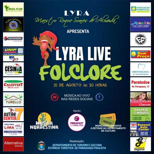 O Departamento de Turismo e Cultura, seguindo o Plano São Paulo, já iniciou a retomada gradativa das atividades culturais no município, com público reduzido e seguindo todas as medidas sanitárias de combate à COVID-19. Neste sábado (21/08) a Lyra Maestro Roque Soares de Almeida, comandada pelo Maestro Cícero Siqueira, apresenta o Lyra Live Folclore, diretamente do palco do Cine Teatro Municipal Lucila Nascimento com início às 20h, tanto de maneira presencial, quanto virtual, nas redes sociais como Facebook e Youtube.