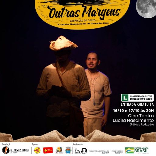 A Cia. Teatral Interventores realizará nos dias 16 e 17 de outubro no Cine Teatro Municipal Lucila Nacimento, às 20h a apresentação gratuita do espetáculo "Outras Margens - Adaptação Livre do conto de Guimarães Rosa, A TERCEIRA MARGEM DO RIO", contemplado pelo Edital nº 03/2020 da Lei Aldir Blanc no município.