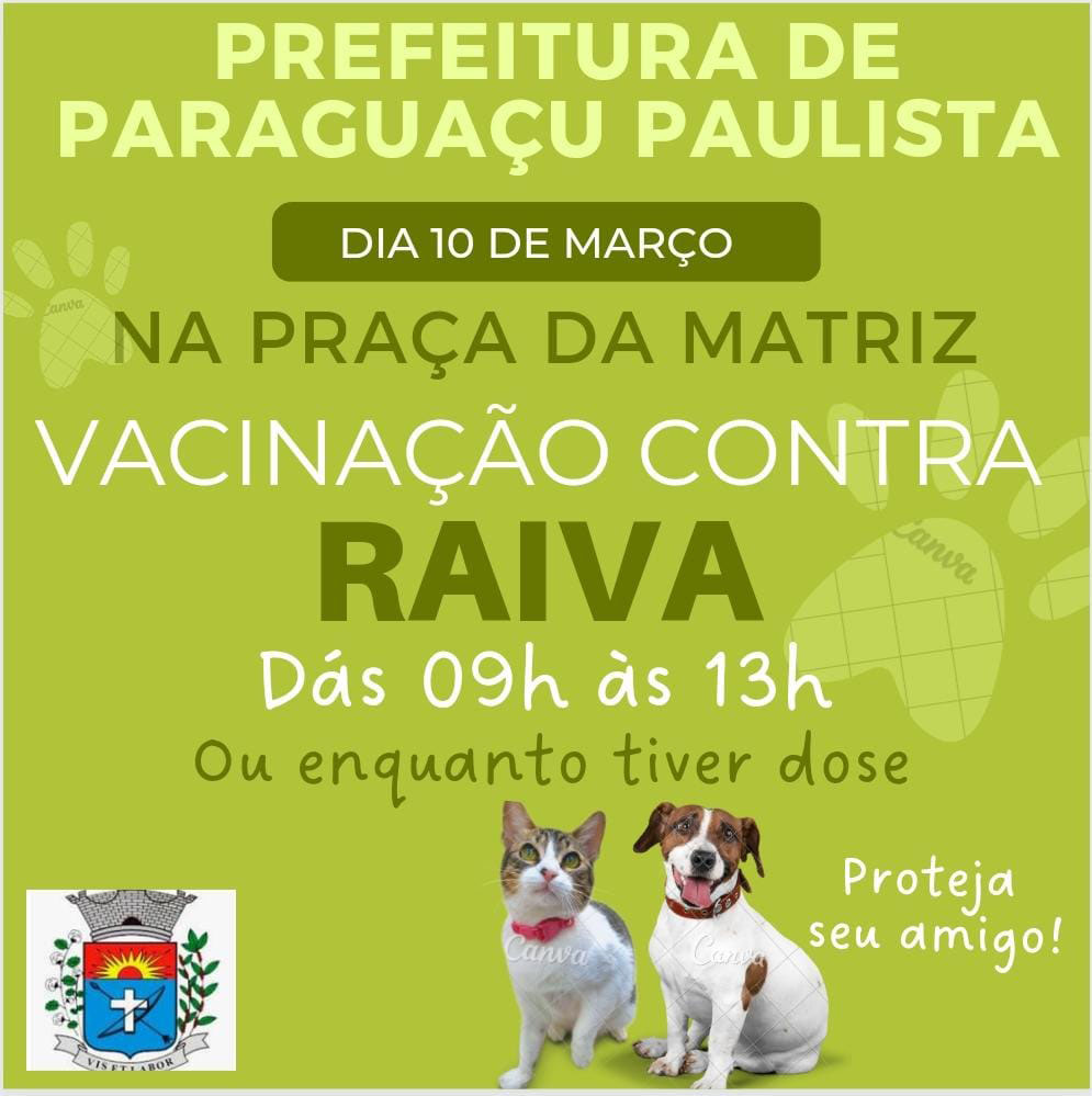 Na próxima sexta-feira, dia 10, será realizada na Praça da Matriz a vacinação contra a Raiva para cães e gatos com mais de 3 meses de vida. A equipe atenderá os tutores e seus animais das 09h às 13h, ou enquanto tiver doses.