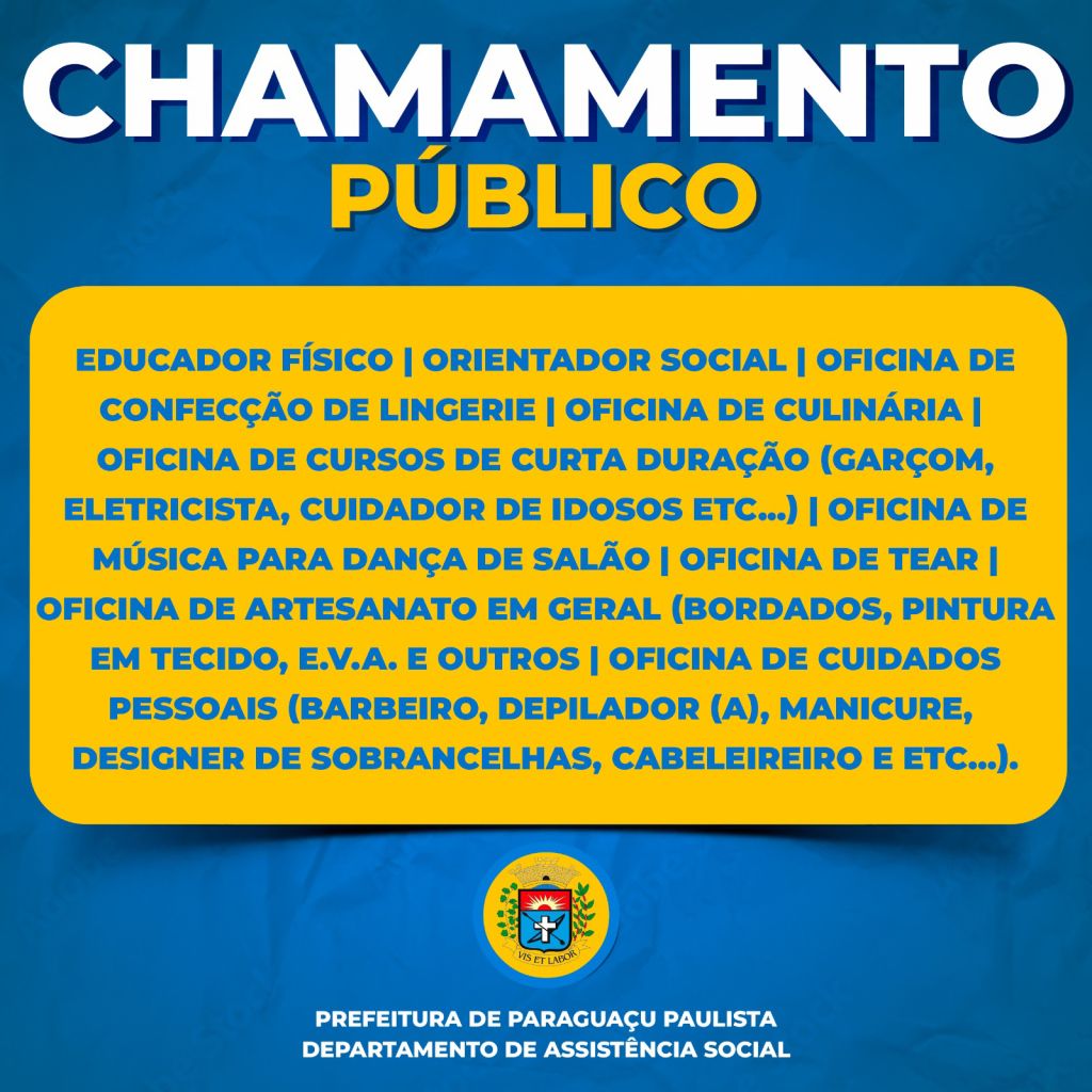 A Prefeitura Municipal de Paraguaçu Paulista está com inscrições abertas para o credenciamento de orientador social, educador físico e oficineiros para prestação de serviço no Departamento Municipal de Assistência Social.