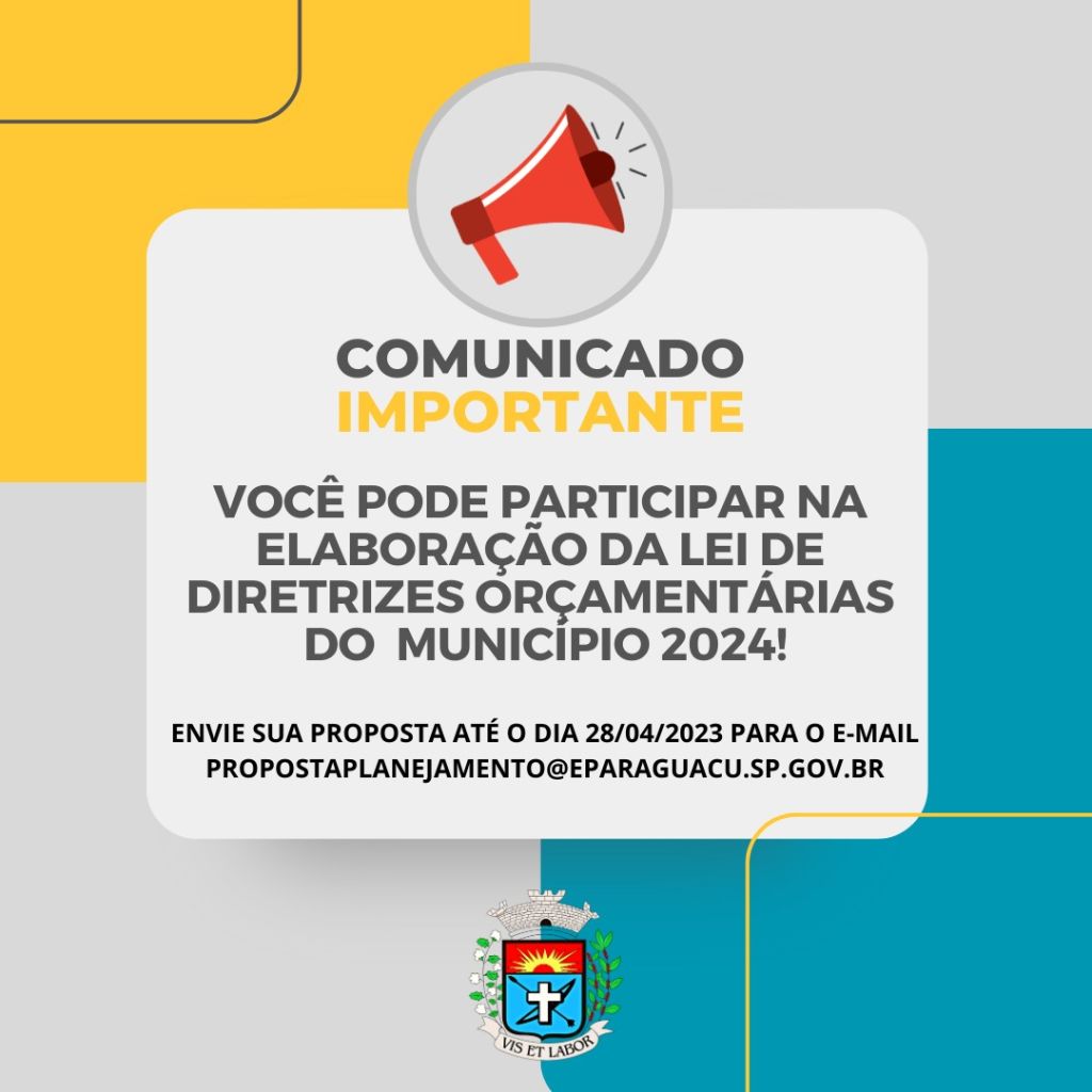 De 12 a 28 de abril a Prefeitura de Paraguaçu Paulista abre espaço para dialogar com a população, buscando entender demandas e prioridades dos munícipes e, deste modo, estabelecer ações e investimentos de forma a atender os moradores da cidade. Participe da LDO 2024 enviando sua proposta para o e-mail propostaplanejamento@eparaguacu.sp.gov.br.