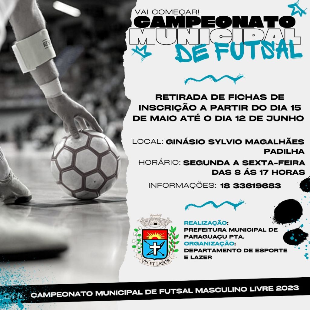 A Prefeitura Municipal de Paraguaçu Paulista, através do Departamento Municipal de Esporte e Lazer, COMUNICA a todos os esportistas do município que a partir do dia 15 de maio de 2023 estará liberada a retirada das fichas de inscrições para o Campeonato Municipal de Futsal masculino, categoria livre.