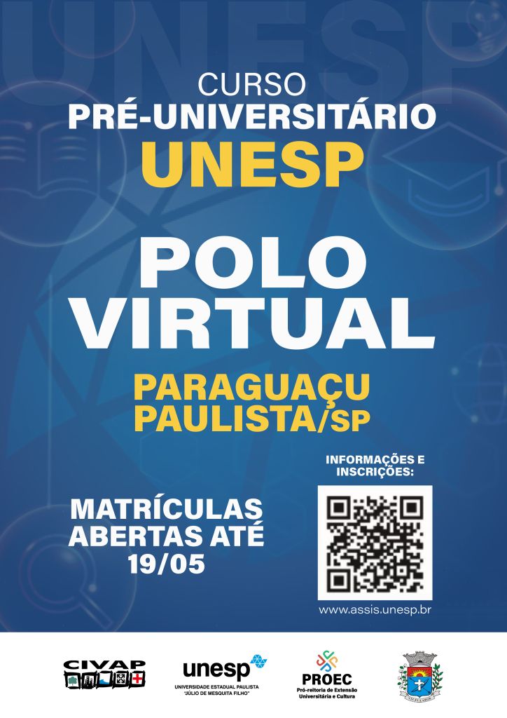 A Prefeitura de Paraguaçu Paulista, por meio do Departamento de Educação e em parceria com o CIVAP e a UNESP, abrem, a partir de hoje, dia 11, até o dia 19 de maio, as inscrições para o Curso Pré Vestibular EAD.